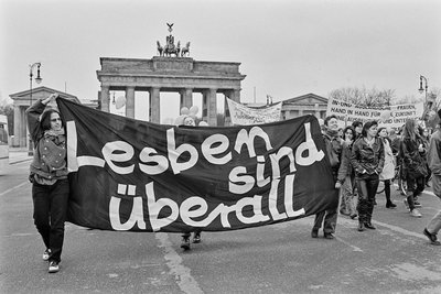 Ebenso bereits seit Juli zeigt das Schwule Museum zudem eine Werkschau von einer "wichtigen Chronistin der Berliner FrauenLesben-Szene": Petra Gall. Die Fotografin zog 1981 im Alter von 26 Jahren nach Berlin und dokumentierte von diesem Moment an für zwei Jahrzehnte die vielfältigen Bewegungen und Aktionen, überhaupt "die umfassende kulturelle, intellektuelle und sexuelle Produktivität der FrauenLesben-Community", wie das Museum mitteilt. Zu sehen sind Aufnahmen von u. a. Demonstrationen anlässlich der Walpurgisnacht, Hausbesetzungen oder einfach ausgelassene Eindrücke von Konzerten und Partys wie in der bis heute existierenden Schokofabrik. Kuratiert wurde die Ausstellung von Collin Klugbauer und Birga Meyer aus dem umfangreichen Nachlass von Petra Gall, der bereits 2012, sechs Jahre vor ihrem Tod, in die Sammlung vom Schwulen Museum einging.